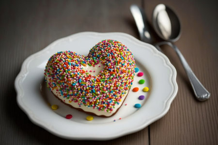 heart-shaped donut plated on white plate, with colorful sprinkles and icing, created with generative ai