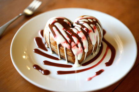 heart-shaped cinnamon roll with drizzled icing on a white plate, created with generative ai