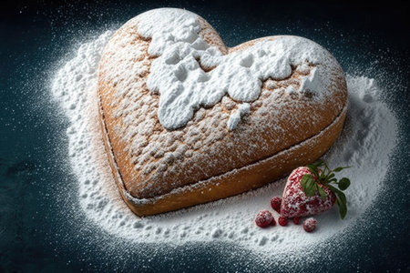 heart-shaped loaf with red berry filling, sprinkled with powdered sugar, created with generative ai