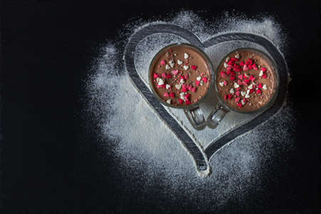 Delicious vanilla and chocolate pannacotta with sugar hearts in a glass on black table with painted heart.