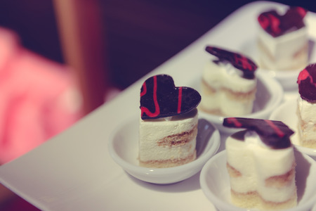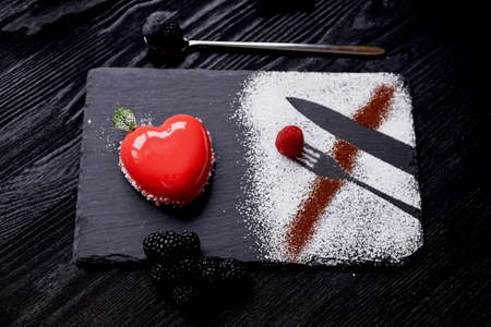 Massovoe cake red heart-shaped dessert on a date. Sprinkled with cocoa and powder.