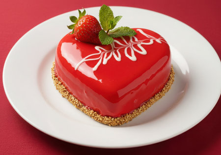 A vibrant red heart-shaped cake with a glossy finish, topped with a fresh strawberry and mint leaves, presented on a white plate.