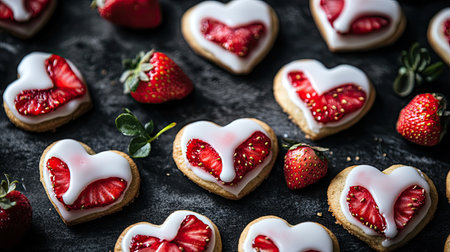 A beautiful arrangement of heart-shaped cookies topped with fresh strawberries and white icing, set on a dark surface, ideal for romantic occasions or festive celebrations.