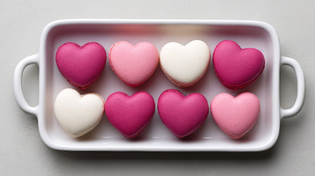 A vibrant assortment of heart-shaped macarons in pink and white hues, beautifully arranged on a tray, ideal for adding sweetness to romantic events and celebrations.