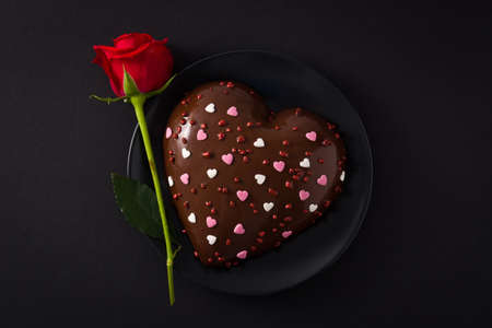 Heart shaped cake and red roses for Valentine's Day or mother's day on black background
