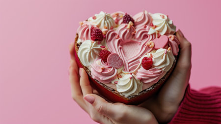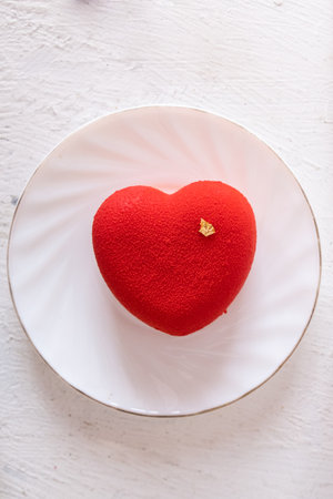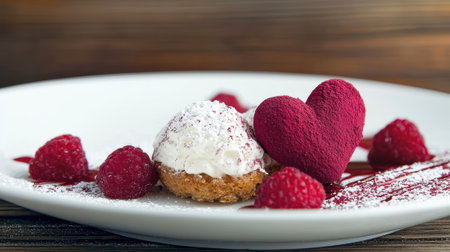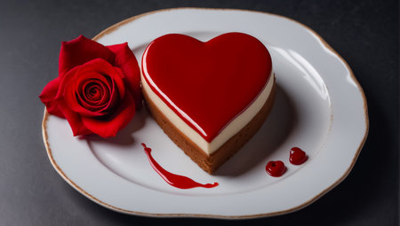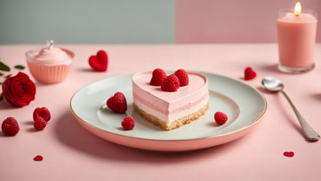 Valentine's Day dessert. A beautifully arranged plate with a single heart-shaped dessert against a simple, pastel-colored background. Minimal Valentine's Day and love concept.