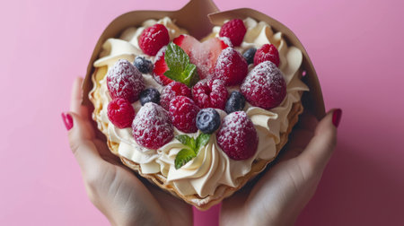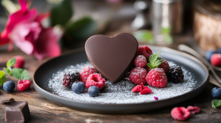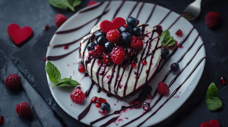 Delicious heart shaped chocolate cake with fresh raspberries and blueberries, perfect for a romantic Valentine's Day celebration