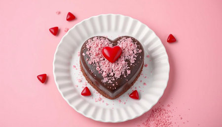 A delightful heart-shaped chocolate cake sits elegantly on a white plate. The cake is adorned with pink sprinkles and a single red heart-shaped decoration on top, adding a touch of romance and sweetness. The background is a soft pink, complementing the theme and enhancing the overall aesthetic appeal.