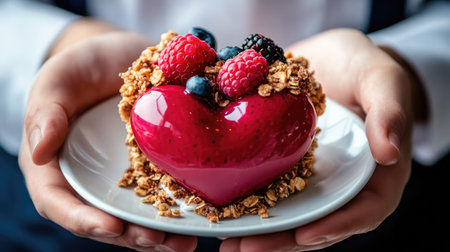 A stunning heart-shaped dessert decorated with vibrant berries and crunchy granola rests on a white plate, perfect for romantic occasions or celebrations.