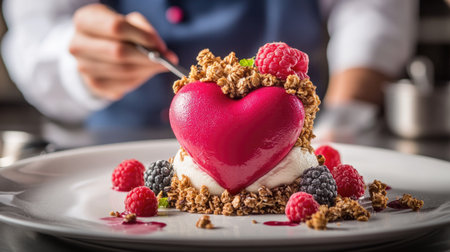 This stunning heart-shaped dessert features vibrant pink mousse topped with fresh raspberries and crunchy granola, perfect for romantic occasions.