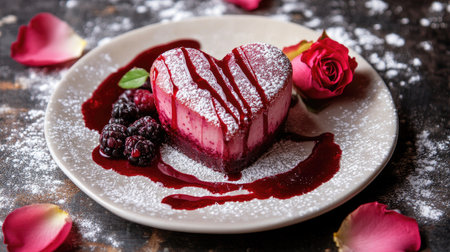 A gourmet Italian dessert with rose-infused panna cotta, deep berry sauce, and a sprinkle of powdered sugar, styled with a Valentine's theme.