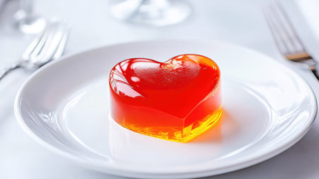 A stunning heart-shaped gelatin dessert sits elegantly on a white plate, perfect for romantic dinners, celebrations, or special occasions. Its vibrant red and orange hues create a captivating visual appeal, making any dining experience special.