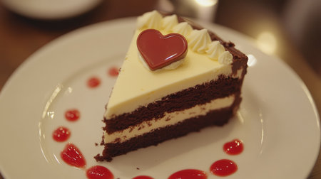 Indulge in this delicious slice of chocolate cake featuring a heart-shaped cream topping, elegantly presented on a white plate with a sweet garnish.