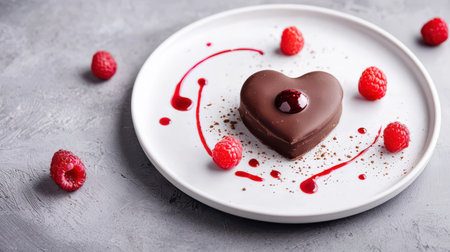 A decadent chocolate heart on a plate garnished with raspberry coulis.