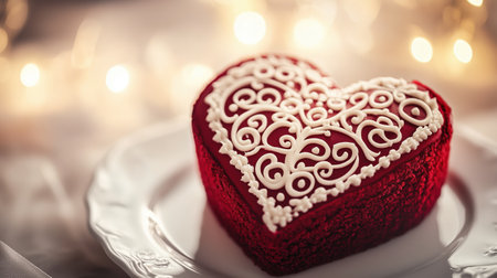 Close-up view of a heart-shaped red velvet cake on a white plate, adorned with intricate white icing. Soft lighting enhances the rich texture and inviting atmosphere, perfect for celebrations.
