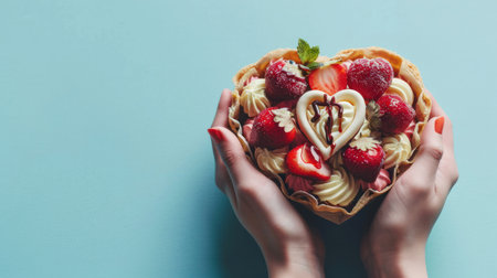 Female hands holding a heart shaped cake with strawberries and mint on a blue background