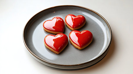 Valentine Day heart cookies with glossy glaze, placed on a plate, styled elegantly with space for text.