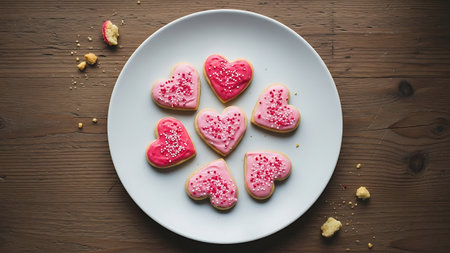 A white plate with heart-shaped cookies, some with pink icing and sprinkles, on a wooden table. The cookies are arranged neatly, and some crumbs are scattered around the plate. Clear details and vibrant colors enhance visual appeal.