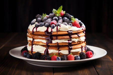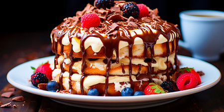 Freshly baked berry pancakes with whipped cream and chocolate sauce generated by artificial intelligence