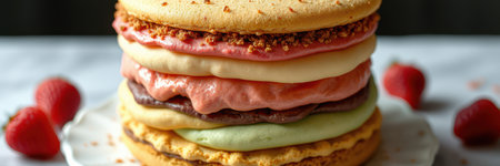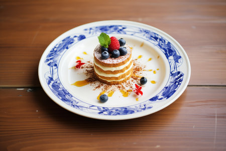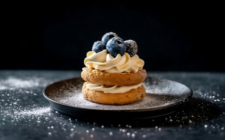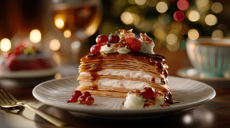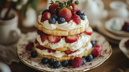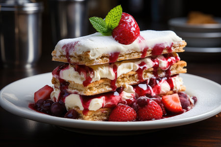 A delectable layered dessert featuring cream and fresh berries, elegantly served on a plate. Perfect for celebrations and special occasions.