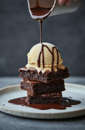 A tempting dessert features stacked brownies topped with a scoop of ice cream and drizzled with warm chocolate syrup, placed on a simple plate. The presentation highlights a delicious treat.