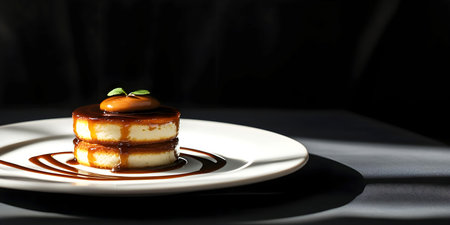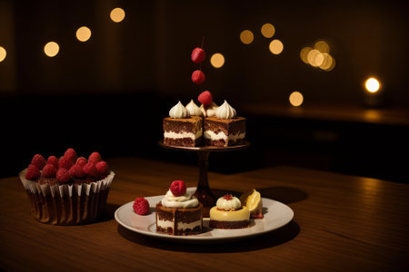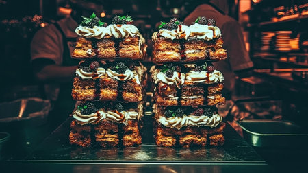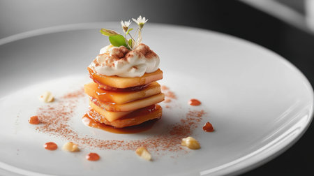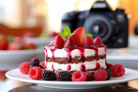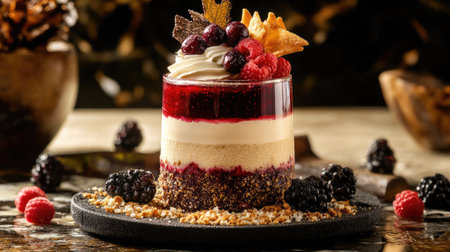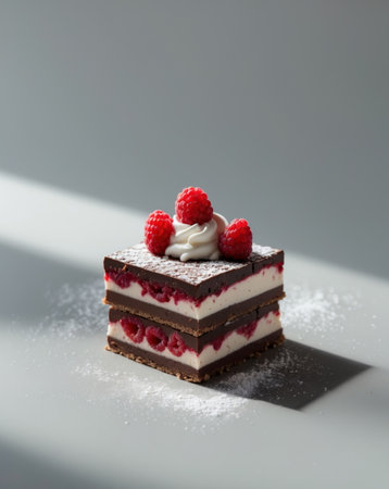 A luxurious dessert with layers of chocolate, fruit, and cream, perfectly plated on a sleek dish, with soft lighting enhancing the artistic details