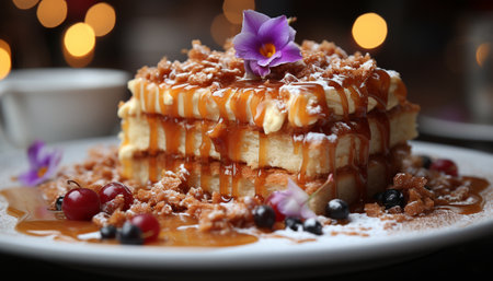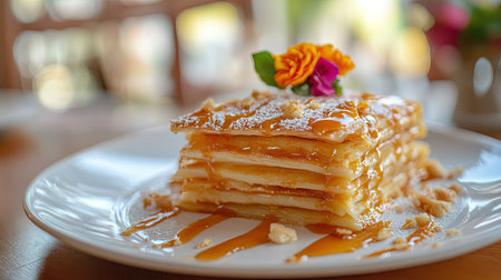 This appetizing dessert features tantalizing layers drizzled with caramel sauce and garnished with colorful edible flowers, perfect for sweet indulgence.