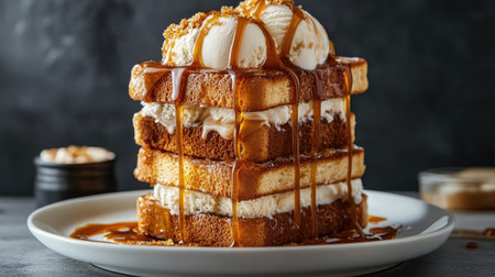 A stunning layered cake featuring rich ice cream and a luscious caramel drizzle, perfect for dessert lovers. Ideal for food photography and seasonal menus.