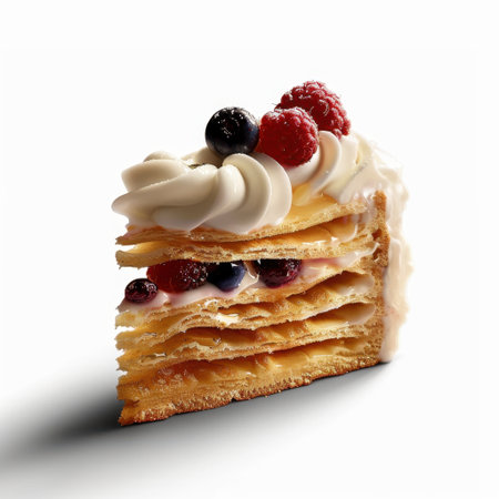 A delectable slice of layered cake featuring luscious cream and fresh berries, perfect for any celebration. Enjoy its vibrant colors and textures!