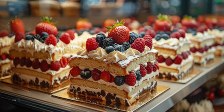 Delicious raspberry cream cake slices displayed in a bakery, topped with fresh raspberries and cream. High quality photo