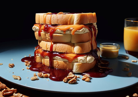 Large sandwich with creamy peanut butter and jam on blue plate.AI Generative.