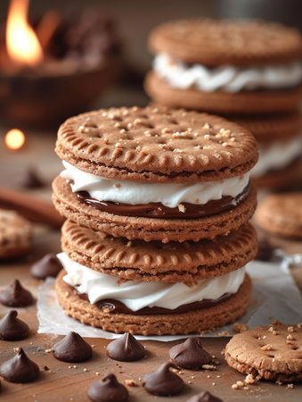 Whimsical dessert burger made from chocolate chip cookies, toasted marshmallows, thick chocolate bars, and gooey caramel. The stacked layers mimic a burger, turning classic sweets into a creative, mouth-watering treat. Surrounded by cupcakes and colorful candy for a playful party atmosphere.