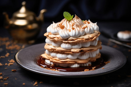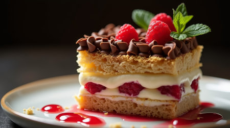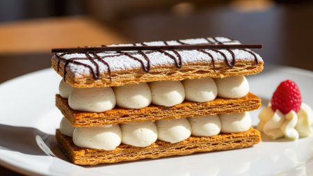 This image presents a layered pastry dessert, featuring golden-brown puff pastry sheets stacked with creamy filling. A dark chocolate decoration and powdered sugar add visual interest. The composition includes a side of whipped cream and a single red raspberry. Suitable for various culinary or editorial projects.