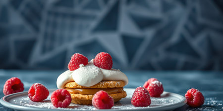 Freshly baked berry pancakes with whipped cream and raspberry sauce generated by artificial intelligence
