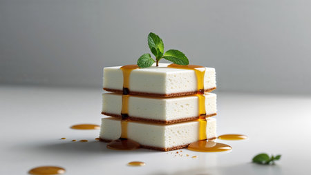 AI Generated. Three stacked square cakes drizzled with golden syrup and mint garnish