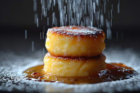 Two golden-brown pancakes stacked, drizzled with caramel sauce, and sprinkled with powdered sugar. a perfect depiction for breakfast recipes, food blogs, and bakery advertisements showcasing delicious, homemade pancakes with sweet toppings. Generative AI