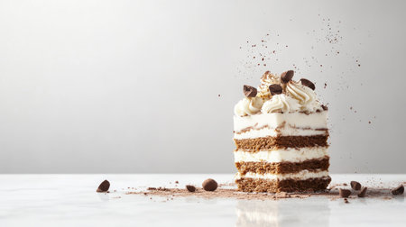 A visually appealing slice of chocolate cake, layered with creamy frosting and topped with delicate whipped cream and chocolate shavings, perfect for any occasion.
