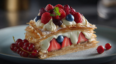 A French millefeuille with vanilla cream and fresh berries, beautifully plated on a white dish, with a backdrop of a rustic gray concrete table.