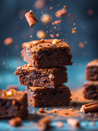 Delicious Homemade Chocolate Brownies with Nuts and Falling Cocoa Powder on a Blue Background AI Generative