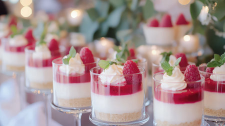 This exquisite dessert features raspberry mousse layered in glass cups, topped with fluffy whipped cream and fresh mint, perfect for festive occasions.