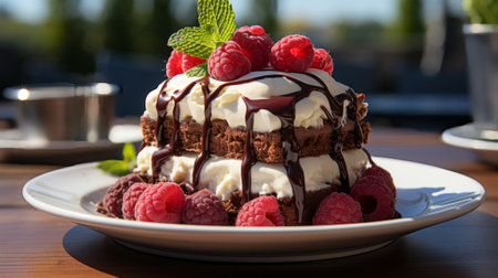 A chocolate cake with raspberries and ice cream on top. Generative AI.