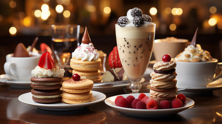 Radiant bokeh background with gourmet desserts and specialty coffee drinks in elegant patisserie