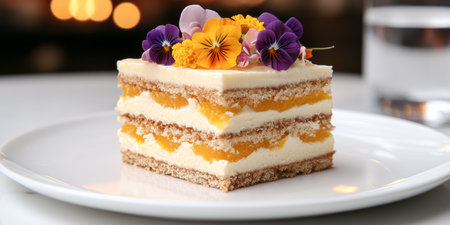 Elegant Slice of Layered Lemon Cake with Edible Flowers on White Plate, Delicious Dessert Concept