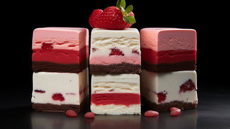 Slices of vibrant raspberry ice cream tower in perfect layers, showcasing rich textures. A single berry adorns the top, enhancing the sweet presentation with a touch of freshness.