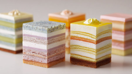 A selection of elegant miniature cakes artfully arranged on a long plate, showcasing culinary expertise and sweet indulgence