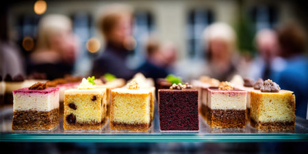 Close-up of various mini-cakes in a row, with out-of-focus people in the background