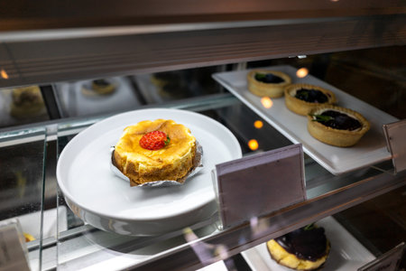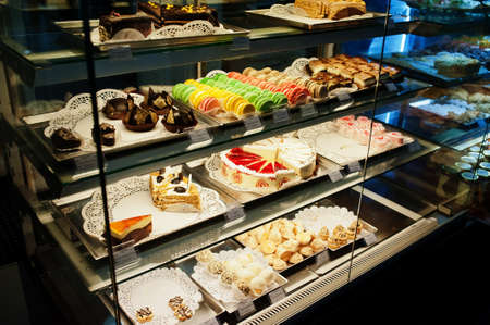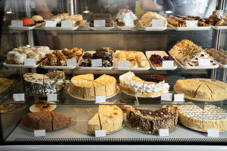 cafeteria, bakery shop with various kinds of bakery such as cookies, cakes, pastries, shopping area.variety of desserts and cakes in the window of a pastry shop.Selective focus.Patisserie, confectionery, sweet products.