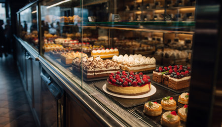 Variety of delicious cakes and pastries, including berry cheesecakes and chocolate layered cakes, are showcased behind a glass display in a modern bakery