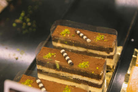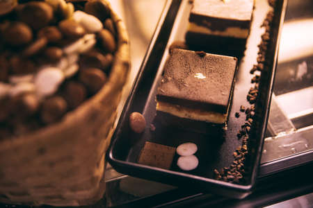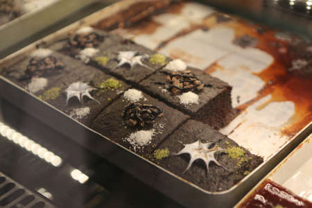 Dessert, chocolate, beautifully placed in the tray ready for sale.