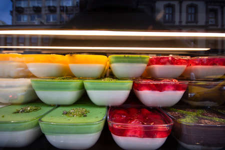 Showcase with sweets and pastries of many varieties. Very colorful. Selective focus.
